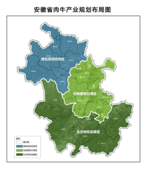 《規(guī)劃》立足安徽資源稟賦、環(huán)境承載能力、產(chǎn)業(yè)基礎(chǔ)和區(qū)位條件等因素,提出以良種繁育為引領(lǐng),以標準化規(guī)模養(yǎng)殖為基礎(chǔ),以產(chǎn)業(yè)融合為重點,以科技裝備為支撐,以種養(yǎng)循環(huán)為紐帶,以“雙招雙引”為抓手,著力擴規(guī)模、提質(zhì)量、延鏈條、創(chuàng)品牌、增效益,培育千億級綠色食品肉牛產(chǎn)業(yè),把安徽打造成中原高品質(zhì)肉牛種源供應(yīng)基地和長三角優(yōu)質(zhì)肉牛生產(chǎn)加工供應(yīng)基地,為推動安徽農(nóng)業(yè)強省、美好安徽建設(shè)貢獻力量。《規(guī)劃》運用畜禽糞污土地承載力測算方法和草畜平衡測算模型,科學開展資源環(huán)境承載能力分析,深入開展市場潛力及全國肉牛產(chǎn)業(yè)發(fā)展趨勢分析,多維度研究提出2023—2030年安徽肉牛產(chǎn)業(yè)發(fā)展目標。《規(guī)劃》堅持因地制宜、分類施策,統(tǒng)籌考慮區(qū)域功能與開發(fā)程度,將全省劃分為皖北、皖中、皖南三個肉牛產(chǎn)業(yè)優(yōu)勢區(qū),提出差異化發(fā)展策略,協(xié)調(diào)推進全省肉牛產(chǎn)業(yè)高質(zhì)量發(fā)展。《規(guī)劃》共謀劃八大類23個重點項目,總投資419.05億元,并通過“自上而下”和“自下而上”相結(jié)合的方式,提出首批推進的項目清單,進一步提高了規(guī)劃的針對性和可操作性。