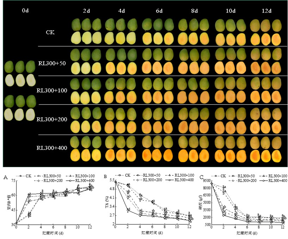 3.研發新型果品光照催熟技術,有效降低果品催熟中乙烯利使用量。通過代謝組學分析,推導紅光誘導芒果采后后熟是有別于乙烯誘導的另一種催熟路徑,提出芒果、香蕉等果品中高強度紅光誘導采后催熟技術,研發紅光乙烯利減量催熟技術,利用300Lx紅光組合400mg/L乙烯利達到1400mg/L乙烯利單獨使用催熟效果,乙烯利使用量減少70%以上。