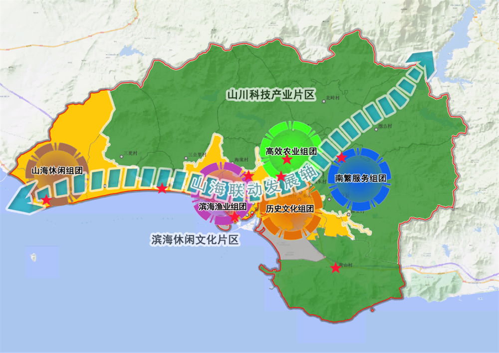 《規劃》突出片區化推進思路。根據地理空間特征、資源分布特點及鄉村發展基礎,將崖州區鄉村整體劃分為山川科技產業、濱海休閑文化兩大功能片區。整合位置相鄰、功能相近、產業相聯的村莊社區,打造南繁服務、高效農業、山海休閑、濱海漁業和歷史文化五大主題組團。各組團選擇1-2個發展基礎好、代表性突出的重點村,建設八個重要節點。依托寧遠河及濱海公路聯結山海片區及組團節點,設計四條主題路線。